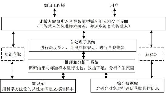 有了总结出的全局形态的普适型的科学方法论的体系和规则,应该将它推广到全社会,人工智能技术的发展为科学方法论的推广和应用创造了条件,它的应用会显著提高做事的效率和效益。由于在上一世纪80年代由美国斯坦福大学费尔鲍姆教授提出并已在社会上得到应用的专家系统受到同行专家的质议,应该对其内容进行必要的补充和完善,使它恢复生机。经过较长时间的分析与研究,将专家系统改进为智能处理系统。(图5)