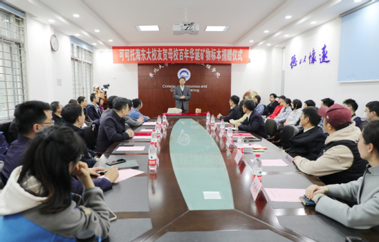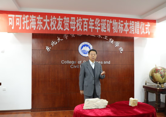 4月4日,可可托海东大校友贺母校百年华诞矿物标本捐赠仪式在采矿学馆227室举行。可可托海东大校友代表、中国工程院院士孙传尧,东北大学副校长张皓,新疆可可托海史料片摄制组成员,东北大学宣传部、对外联络与合作处、资源与土木工程学院相关负责人和师生出席捐赠仪式。