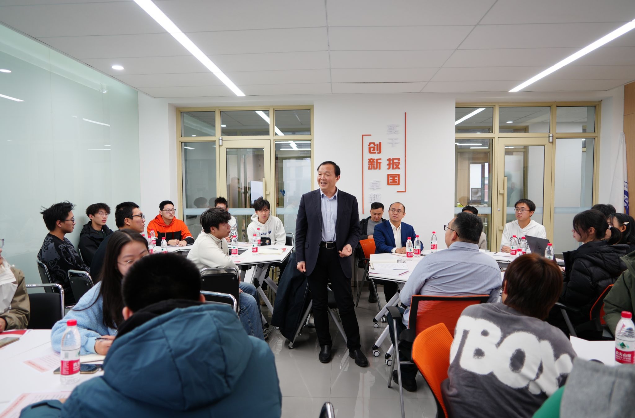在认真听取学生发言后,郭海为学生作“中国式现代化与新时代青年”的报告。