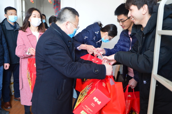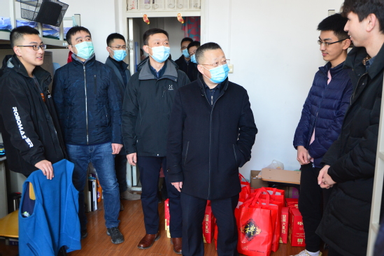 张国臣代表学校向留校学生致以新春问候,详细了解了疫情防控常态化背景下留校学生的学习生活状况,为同学们送上防疫物资、春节礼包以及《习近平用典》《只争朝夕不负韶华——新时代奋斗者》两本图书。张国臣叮嘱同学们要健康科学防疫,合理规划时间,保持良好习惯,增强体育锻炼,加强与亲友线上互动,度过一个健康、有意义的寒假。留校学生对学校领导老师的关心和慰问表示感谢。