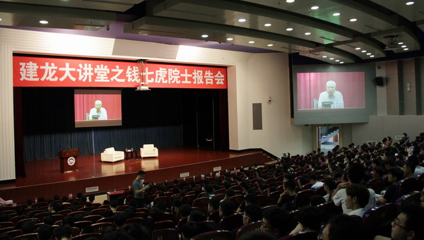 视频报告后,钱七虎与学生进行了互动,分享了自己获得国家最高科学技术奖时的激动心情以及所感受到的自身所肩负的责任,并和同学们就正确认识历史、树立远大理想、正确处理好集体和个人之间的关系、培养团队精神、锻炼健康体魄等话题进行了深度沟通。面对青年学子的困惑,钱七虎院士给出他的建议:年轻人走向社会,首先应该想着如何奉献自已的才华,而不是先找一个既安逸待遇又高的岗位。“责任担当往前上,有名有利向后靠。”当一位即将升入大二的学生在交流时问道,今天的大学生该如何面对未来的学习、就业、科研、出国等方面压力时,钱院士首先提到了“天才就是勤奋”和“机会永远是给有准备的人”这两句话,他希望同学们在大学里要学会做好三件事:学会学习、锻炼体魄、培养责任心。