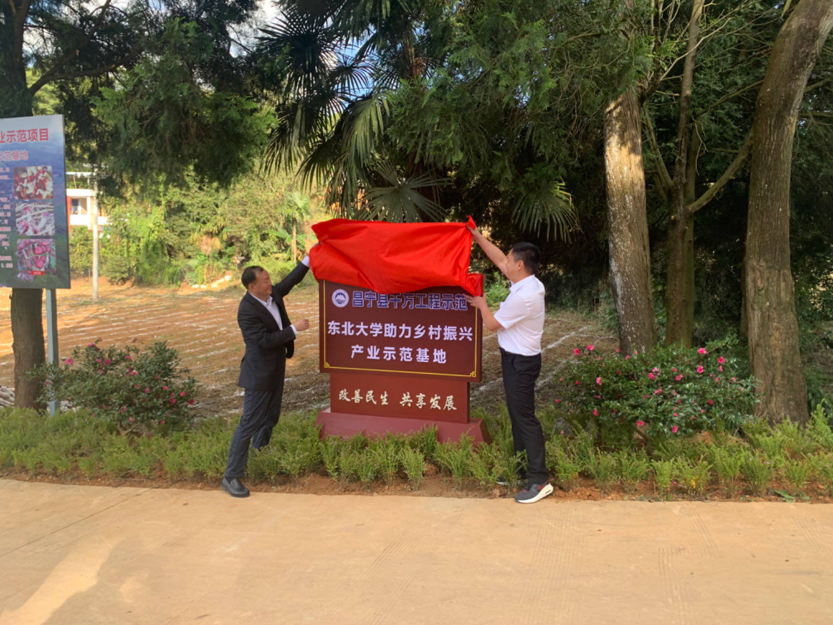 随后,郭海、王玉琦一行深入东北大学助力乡村振兴产业示范基地——昌宁县田园镇四角田赤松茸种植基地调研帮扶项目建设实施情况,并为东北大学助力乡村振兴产业示范基地揭牌,该基地为昌宁县千万工程示范项目。