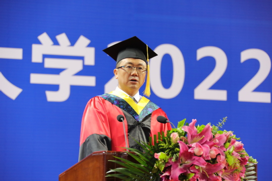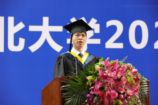 机械工程与自动化学院机械工程专业王瑞明同学代表毕业生发言。王瑞明表示,四年时光,东北大学承载了太多的青春故事,这些与东大相逢的点滴必将成为青春岁月里最珍贵的记忆。东大学子已将母校深厚的爱国主义传统、“自强不息,知行合一”的校训精神和“实干、报国、创新、卓越”的东大文化融入基因血脉。同学们将在青春的赛道上奋力奔跑,跑出东大人最好的成绩,以实际行动向党的二十大献礼,以昂扬之姿迎接东大百年校庆。