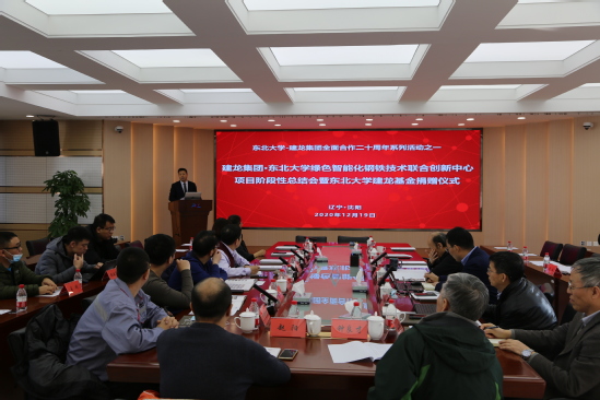 12月19日,建龙集团·东北大学绿色智能化钢铁技术联合创新中心项目阶段性总结会暨东北大学建龙基金捐赠仪式在轧制技术及连轧自动化国家重点实验室学术报告厅举行。建龙集团副总裁、抚顺新钢铁总经理杨宪礼,中国工程院院士王国栋,东北大学副校长孙雷出席会议,联合创新中心相关专家团队参加会议。