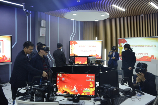 校领导利用基地提供的党史体验馆、“拥抱风雨,砥砺前行”展馆等资源,通过虚拟现实技术,现场体验了交互式学习的乐趣,身临其境地学习了一次党史。校党委书记熊晓梅表示,示范基地通过三维动态实景和实体行为的系统仿真,真实重现历史,使人有种亲身参与历史事件的感觉,希望基地能够吸引更多的学生参与体验式学习,沉浸其中,真正爱上党史学习。
