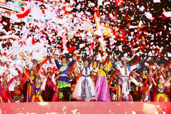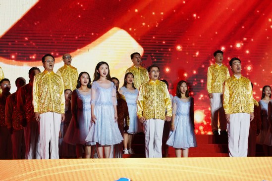 礼赞中华篇章中,通过舞蹈《奋进》,歌曲联唱《澎湃之声》《我们走在大路上》《在希望的田野上》《没有共产党就没有新中国》,民族舞《欢歌中华》等节目,展现全国各族人民在中国共产党的领导下不断实现对美好生活的向往,向着复兴、向着胜利高歌前行的豪迈和自信。