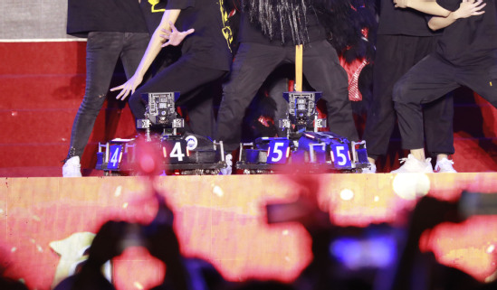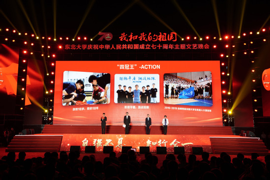 创意舞蹈《未来已来》中,今年暑假勇夺全国大学生机器人竞赛RoboMaster2019机甲大师赛总决赛冠军的东北大学T-DT创新团队和学校大学生艺术团共同上台,人机翩翩共舞,让师生们眼前一亮,喝彩不断。歌伴舞《没有强大的祖国哪有幸福的家》《不忘初心》等节目精彩纷呈、创意无限。在节目的最后,大合唱《我爱你中国》《我和我的祖国》将整场晚会推向高潮,全场师生挥舞着手中的国旗,齐声高唱:“我和我的祖国,一刻也不能分割,无论我走到哪里,都流出一首赞歌,我歌唱每一座高山,我歌唱每一条河……”对祖国的热爱之情充溢全场,表达着东大师生对祖国未来美好的期待。