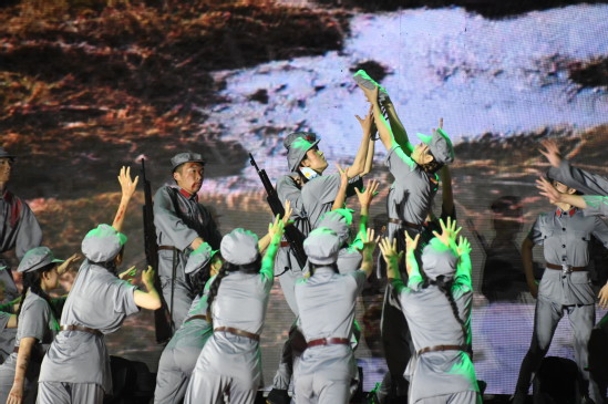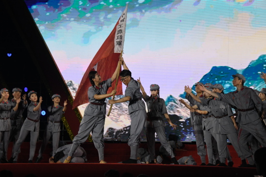 在第一篇章“历史的选择”中,宋黎人物的讲述再现了从五四运动到一二九运动,无数青年学子救亡图存、爱国抗争的青春豪情。歌舞《红船向未来》精彩演绎了中国共产党的伟大启航。音舞表演《长征颂》和抗日情景组歌《五月的鲜花》《长城谣》《毕业歌》,重现了革命时期那段山河破碎,战火纷飞的峥嵘岁月,生动展现了在艰难的长征路上,在抗日战争的沙场上,中国共产党团结带领中国人民浴血奋战、淬火成钢的伟大历程。“反对华北自治,东大人誓死不做亡国奴”一声声呼号震天动地,一次次呐喊泣血惊心,再现了以宋黎为代表的一代东大人,为国为民,奔走抗争的伟大爱国主义精神。振奋人心的大合唱《没有共产党就没有新中国》印证人民选择了共产党是伟大的历史选择。