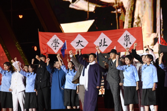 第三篇章“家国的希望”的开篇以人物演绎和视频连线的方式讲述了李华天教授和刘积仁教授师生的奋斗故事。情景剧《选择》生动再现以“五四煤”班为代表的一代代东大人在支援国家生产建设中的不懈身影和“可可托海的东大人”为祖国发展倾心奋斗一生的光辉事迹。离退休老教师的小合唱《祖国不会忘记》《革命人永远是年轻》深情演唱了老一辈东大人丹心向党,对科技发展和学校建设绵绵不绝的赤诚情怀。歌舞《春天的故事》跃动着改革开放的春潮。大合唱《共筑中国梦》以动人的旋律,展现了国家风云激荡、天翻地覆的发展奇迹,唱响了东北大学师生矢志不渝为实现中华民族伟大复兴中国梦而不懈奋斗的精神。