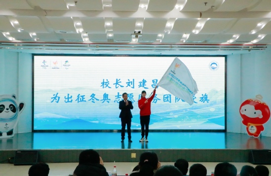 刘建昌为出征冬奥会志愿服务团队授旗。