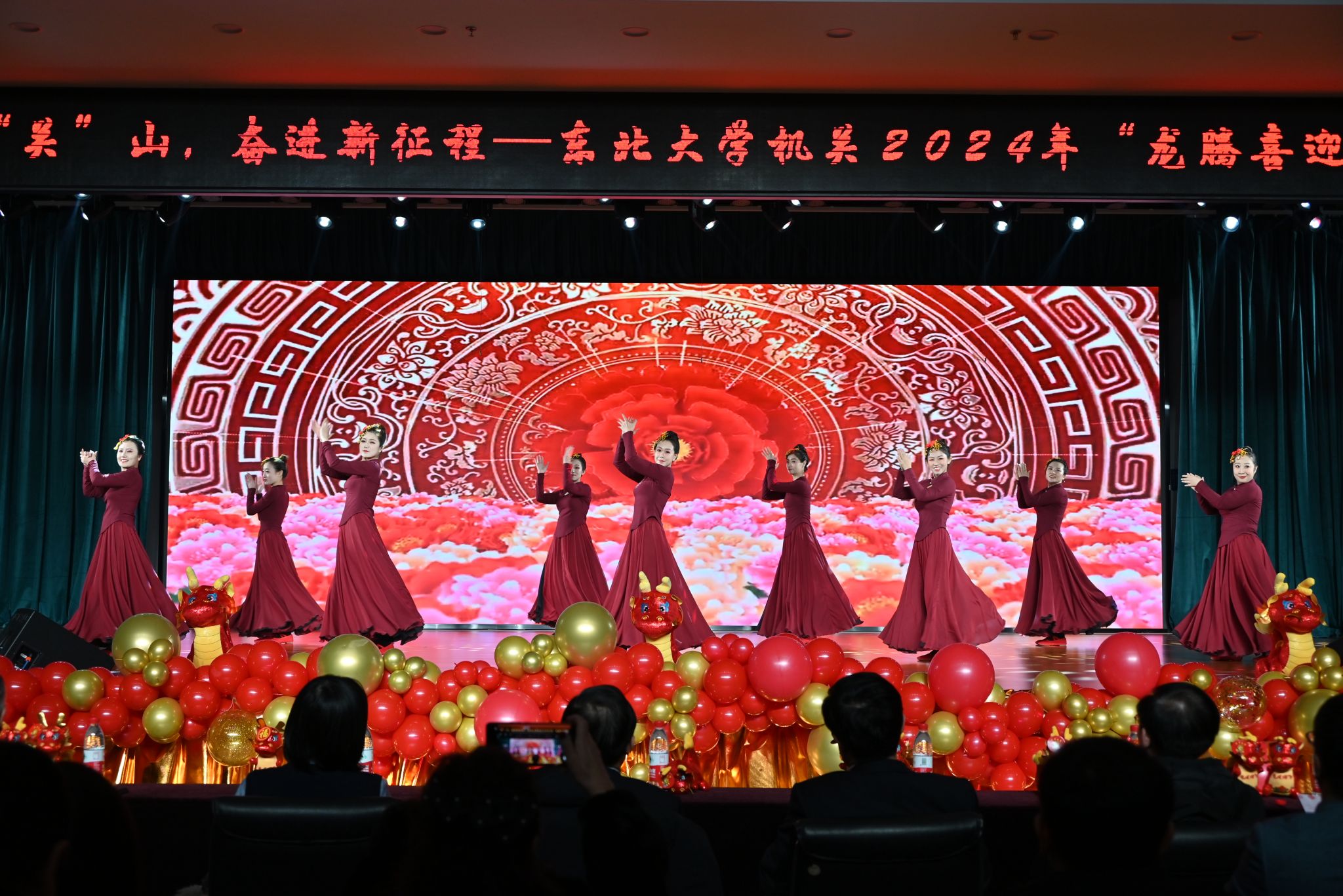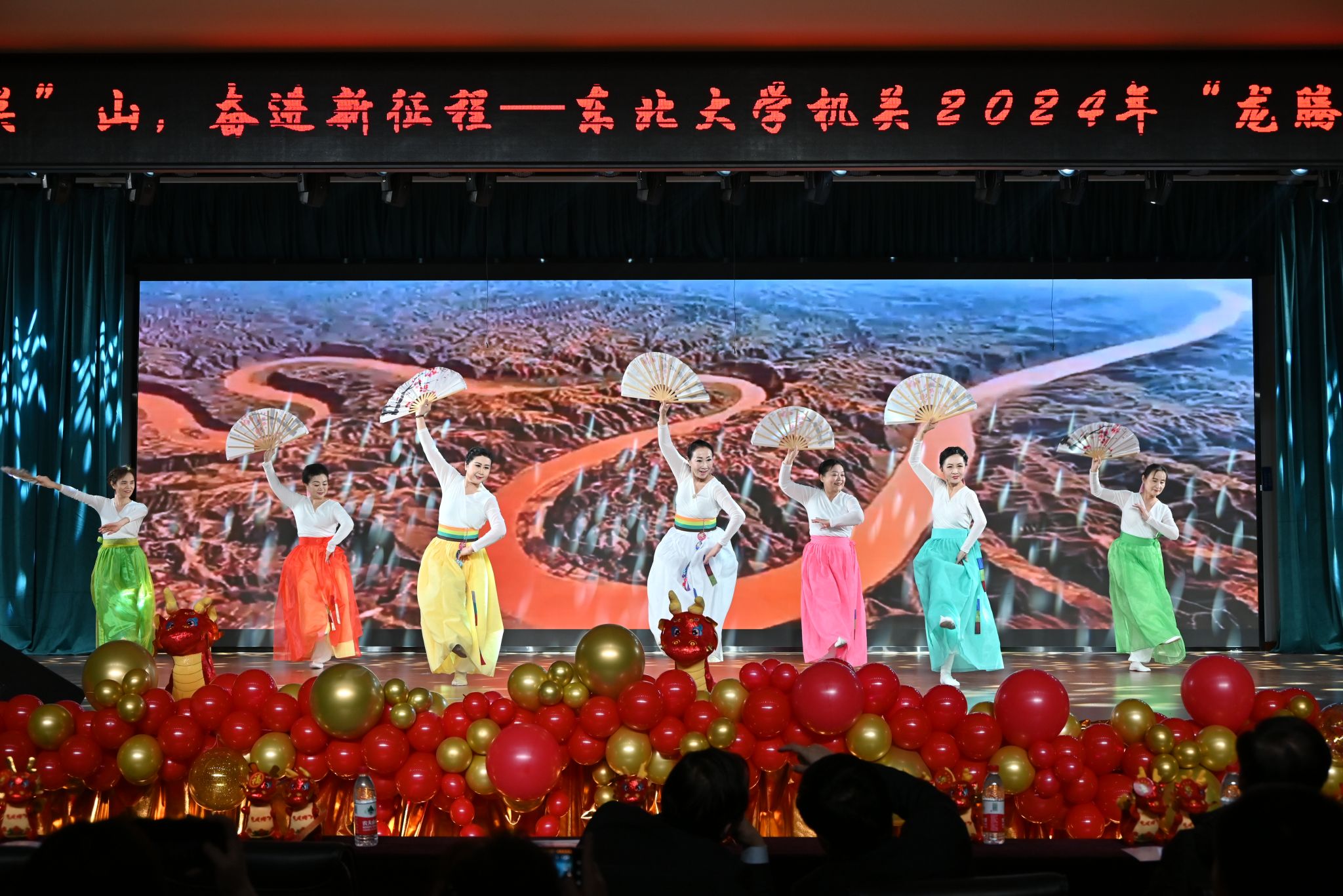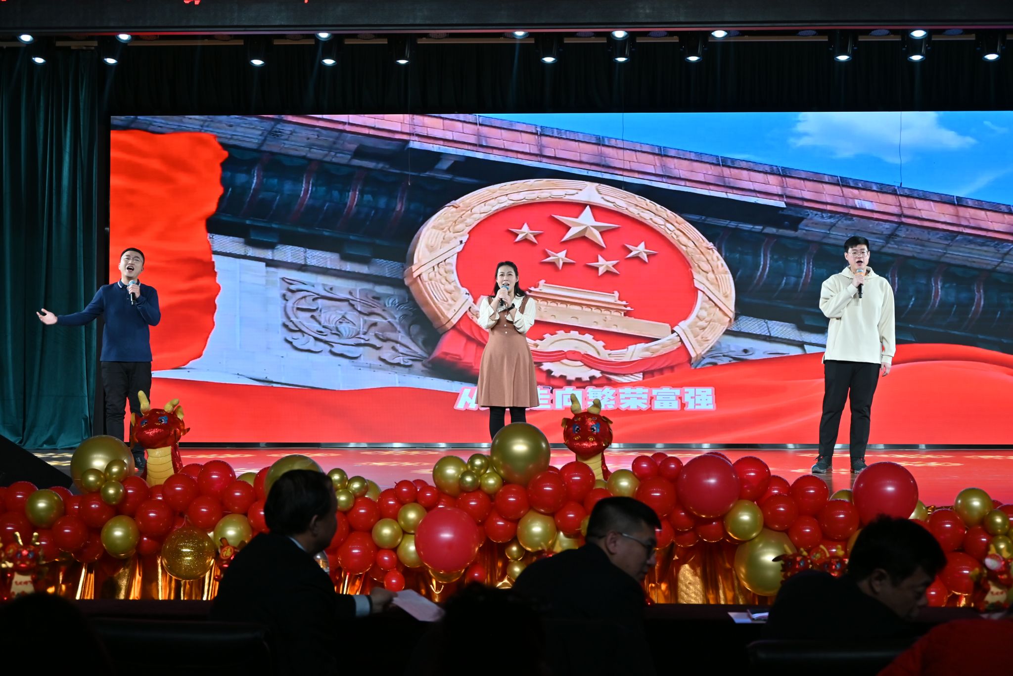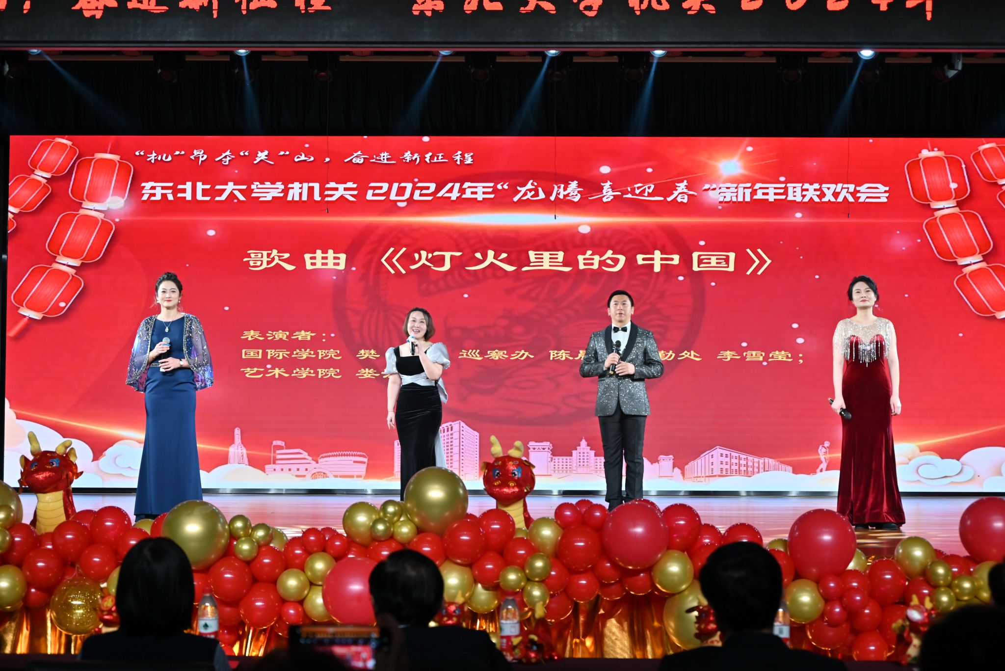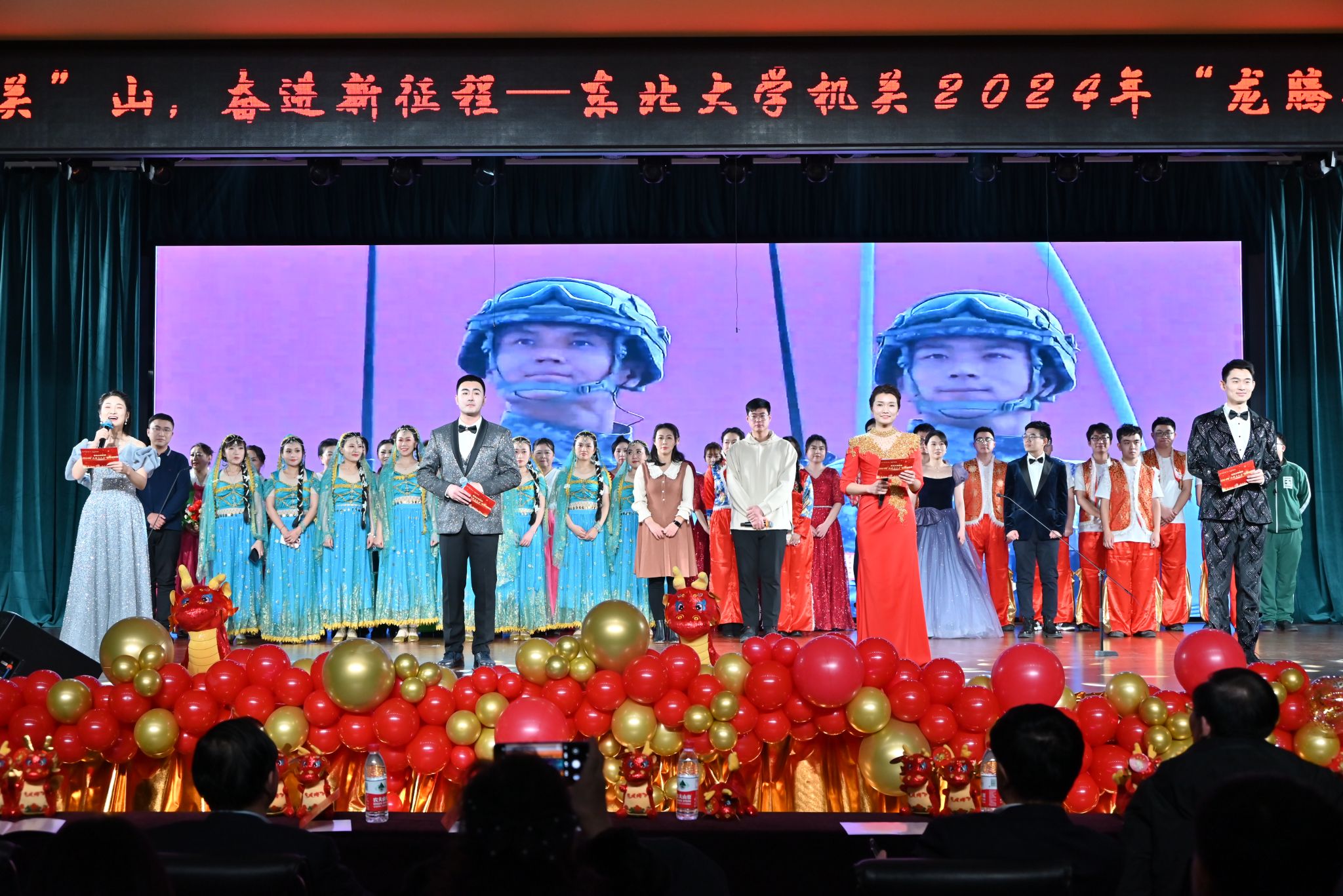 12月27日中午,由校机关党委、机关工会共同主办的“机”昂夺“关”山,奋进新征程——东北大学机关2024年“龙腾喜迎春”新年联欢会在学生活动中心多功能厅举行。中国银行沈阳分行副行长刘凌冰,中国银行自贸区支行行长银炳少、副行长刘子嫣,校党委书记郭海,校长冯夏庭,校党委副书记王玉琦,副校长王强、王兴伟、张皓与机关全体工作人员共同参加联欢会。