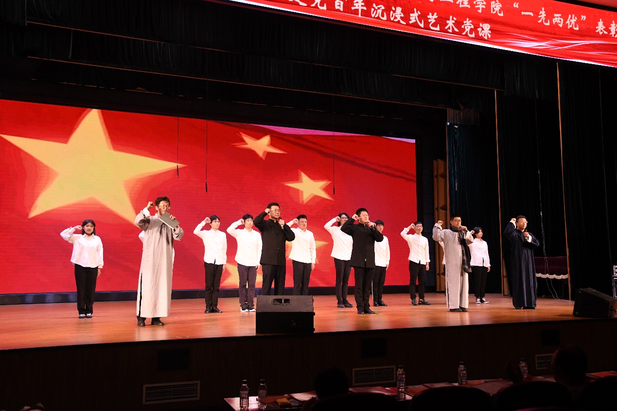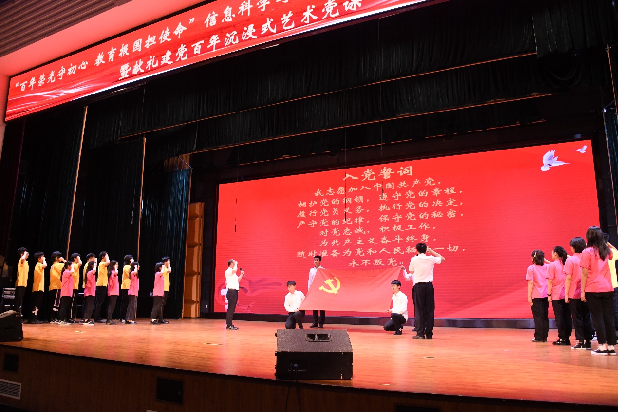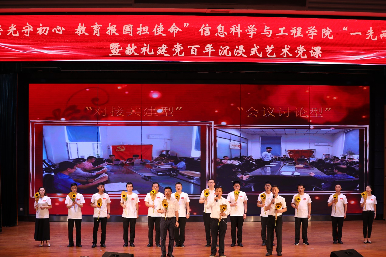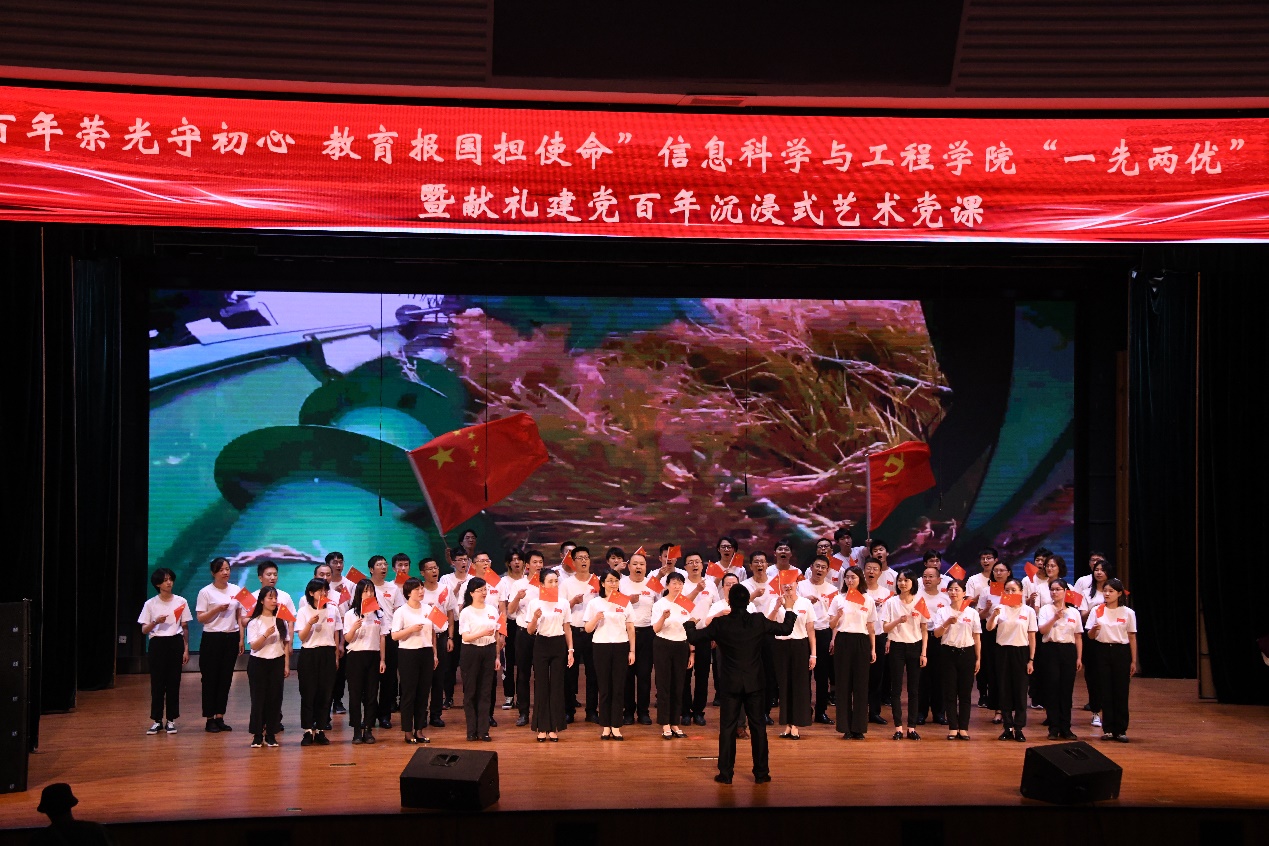 在庆祝建党百年沉浸式艺术党课中,信息学院师生带来了精彩纷呈的歌舞表演。舞蹈《灯火里的中国》优美动人,展现了党的领导下中国百年发展的宏图伟业,表演者自信昂扬的风貌展现了中国共产党领导下的强国自信;舞台剧《觉醒年代》情节引人入胜,将中国共产党的诞生重现在与会观众眼前,带领全体师生重返红色年代,感受共产党人的理想与信念;赵姝颖和丛浩阳、王丹阳带来的师生对唱《妈妈教我一支歌》传达着东信人对党的真挚感情,向建党百年献上嘹亮的赞歌;藏族学生尼玛扎西、扎西顿珠讲述了新时代自己的求学“长征路”,从小学便开始住校,不断远走求学,为了改变命运努力考入内地,以回报家乡为志愿到东北大学学习,用自己的行动践行着习近平总书记“每一代人都有自己的长征路,每一代人都要走好自己的长征路”的殷切期盼,最后尼玛扎西和扎西顿珠以藏文朗诵《共产党宣言》结束了他们的讲述;教师王洪海、匡韩斌、朱笑晨、苑振宇带来歌曲《新征程》,以充满活力的歌声诉说中国共产党栉风沐雨的百年征程,展现了“行胜于言、敢为人先、和而不同、居安思危”的院训精神,表达了传递奋斗火种,续写东信辉煌的心愿;张化光教授《心有大我,至诚报国》的演讲表达了自己一路走来的报国之情,介绍了团队项目取得的成就以及凝聚力,并带领电气工程系教师一起合唱《我的祖国》,歌颂伟大的祖国,表示将用无悔的科研奋斗回报国之重任;潜水艇“奋斗者”号控制软件负责人、优秀校友赵兵,分享了从事载人深潜科技创新的道路,七年来赵兵一直致力于载人潜水器的研制,执行了72次下潜,从未产生一次退缩,这是一份精神、一份责任、一份担当,并表示将发扬严谨求实、团结协作、拼搏奉献、勇攀高峰的中国载人深潜精神,为筑建科技强国贡献东信力量;《祖国不会忘记》是由在学院工作了几十年的教师们带来的合唱,唱出了东信科研工作者的心声,他们的贡献与付出,东信不会忘记、祖国不会忘记;“优秀教职工共产党员”杨东升、辽宁省“优秀大学生共产党员”及文鹤带领新党员面向党旗庄严宣誓,与会党员们也一同重温入党誓词;东信学生合唱团精神饱满地带来了合唱《少年》,用歌声热情讴歌伟大的祖国,在歌声中传达了少年强则国强的精神。活动在大合唱《在灿烂的阳光下》中落下帷幕。