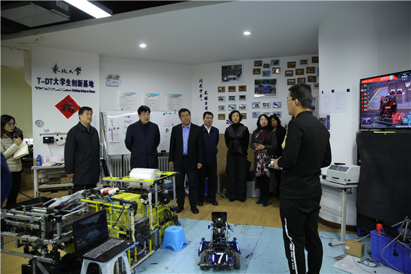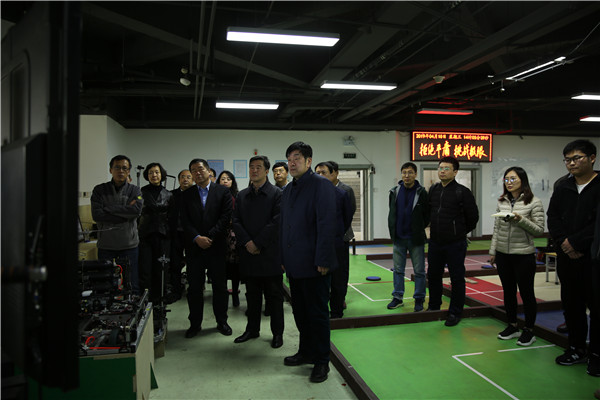 座谈会前,赵世宏一行在杨明的陪同下参观了创新创业基地,重点了解Action机器人创新实验室、T-DT创新实验室等学生创新基地情况。