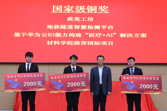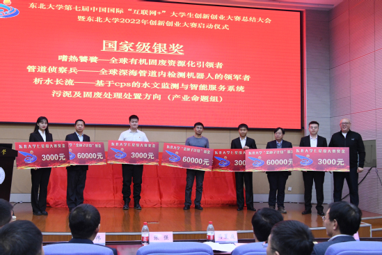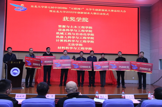 会上,冯夏庭、张强、王建华分别为获得国家级奖励的师生及所在学院颁奖。第七届中国国际“互联网+”大学生创新创业大赛国家级金奖项目代表、东北大学资源与土木工程学院副教授袁帅,机器人科学与工程学院硕士研究生曾振作项目路演汇报。2021年,点石成金、舞指科技等10支项目团队在第七届“互联网+”大赛中为学校争得了2金4银4铜1个单项奖的优异成绩。学校也从4000余所参赛高校中脱颖而出,历史性首此获得“互联网+大赛”高校集体奖,全国普通高校仅20家获此殊荣。中共辽宁省委教育工委、辽宁省教育厅授予东北大学“互联网+”大学生创新创业大赛突出贡献奖,并决定给予每项金奖奖励20万。学校奖励国赛获奖团队卓越奖学金,奖励国家级金奖、银奖团队指导教师6万元金种子基金,分别奖励国家级金、银、铜奖获奖学院10万、5万、2万的奖励性建设基金。同时,实施教师职称评聘、绩效考核双创亮点政策。