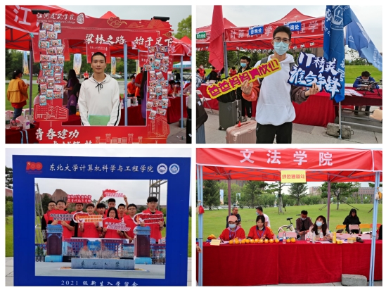 在南湖校区迎新现场,东北大学ACTION团队向新生们发出“人机大战”挑战,东北大学学生会、学生科学技术协会、校园传媒联盟等学生组织和社团向新生们展示着东北大学活跃的校园文化。外国语学院学生身着富有国际特色的服装,迎接新生到来;艺术学院现场进行精彩的木偶戏表演,吸引大家纷纷驻足欣赏;理学院、信息学院设立了新生留影处,为每位新生留下美好回忆;资土学院、冶金学院精心准备了写有创意标语的迎新卡纸;机械学院前的机器人表演给新生们带来充满创意与科技感的祝福;材料学院憨态可掬的吉祥物热情向新东大人发出最温暖的问候“欢迎你,2021级本科生!”;体育部、民族教育学院为新生精心准备了文创开学大礼包 ……