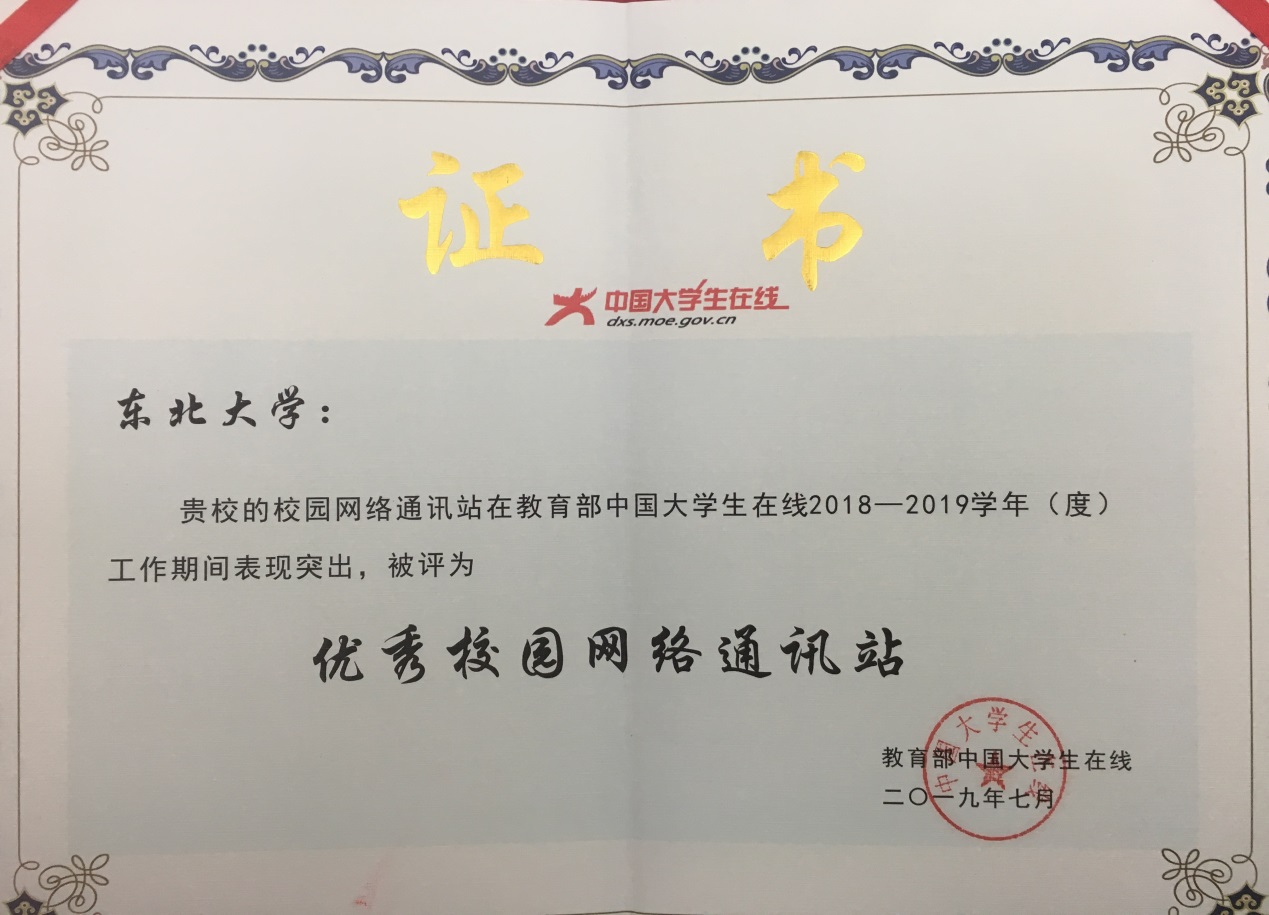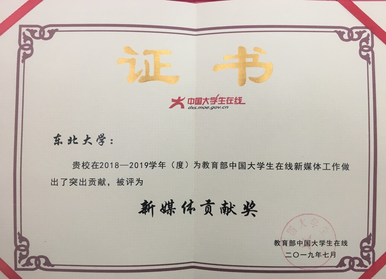 东北大学获评2018-2019年度教育部中国大学生在线“优秀校园网络通讯站” “新媒体贡献奖”,相关指导教师获评 “校网通讯优秀指导教师”“优秀校园媒体人”称号。