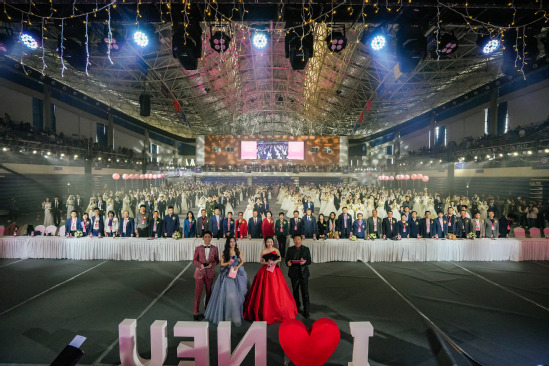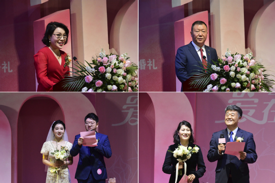 伴随着婚礼进行曲,在如梦似幻的浪漫灯光秀照耀下,校友们身着盛装,在一对一志愿者的陪伴下款款步入舞台中央。熊晓梅作为本次集体婚礼的证婚人,代表全体师生员工和海内外校友对全体新人表示衷心的祝贺。