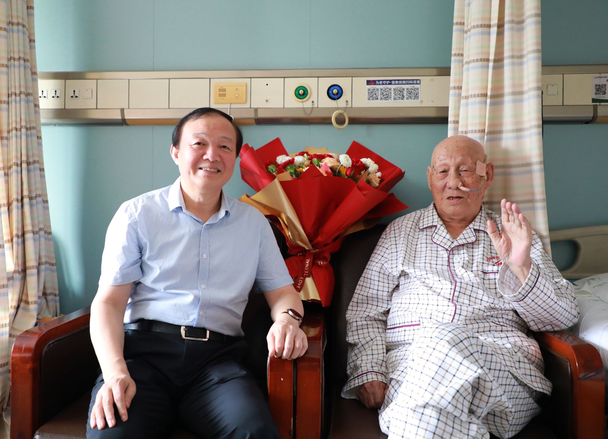 郭海表示,老战士是民族的英雄、国家的功臣,也是东北大学的宝贵财富和骄傲,老战士们身上所体现的崇高爱国主义精神和英勇无畏的革命意志,是激励一代代东大人传承红色基因,砥砺前行、报效祖国的强大精神动力。郭海关切地询问了李导的身体状况、治疗进展及生活情况,细心倾听了他的所需所盼,并汇报了学校在教育强国建设新征程上的各项扎实举措。郭海叮嘱李老保重身体、安心休养,并表示学校将一如既往地关爱并照顾好老战士、老干部,严格落实各项优抚政策,积极主动为他们排忧解难,全力做好服务保障工作,祝福老人家健康长寿,安享幸福晚年。