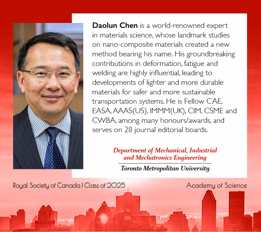 当地时间9月4日,加拿大皇家学会(The Royal Society of Canada)公布了2025年新增院士名单,东北大学材料科学与工程学院1979级校友、多伦多都会大学(Toronto Metropolitan University) 教授陈道伦校友当选加拿大皇家科学院院士(The Academy of Science of the Royal Society of Canada)。