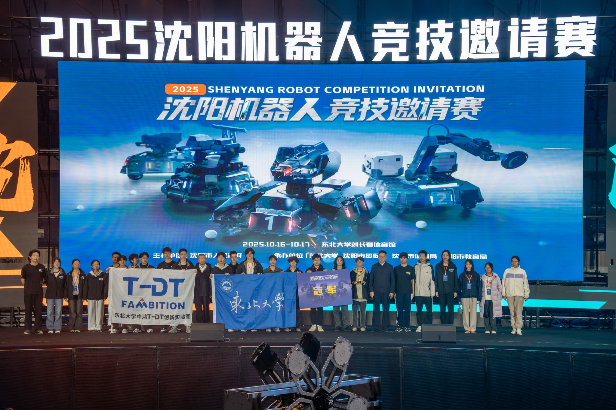 10月17日下午,2025沈阳机器人竞技邀请赛决赛暨颁奖典礼在东北大学刘长春体育馆举行。沈阳市委副书记李鹏宇,市委常委、统战部部长杨志宏,市政府副秘书长罗磊,东北大学校长冯夏庭、副校长王强,沈阳市贸促会党组书记徐强、会长孙锦花,辽宁省教育厅高等教育处处长胡承波,宁夏理工学院校长吴伟,沈阳市和平区委常委、副区长刘惠斌,市体育局副局长李焕发,市教育局一级调研员关英等出席颁奖典礼。经过两天的激烈角逐,东北大学中鸿TDT战队勇夺冠军,中国科学技术大学 RoboWalker战队喜获亚军,大连理工大学凌BUG战队、哈尔滨工程大学创梦之翼战队分获季军和殿军。李鹏宇、杨志宏、胡承波分别为冠亚季军队伍颁奖。