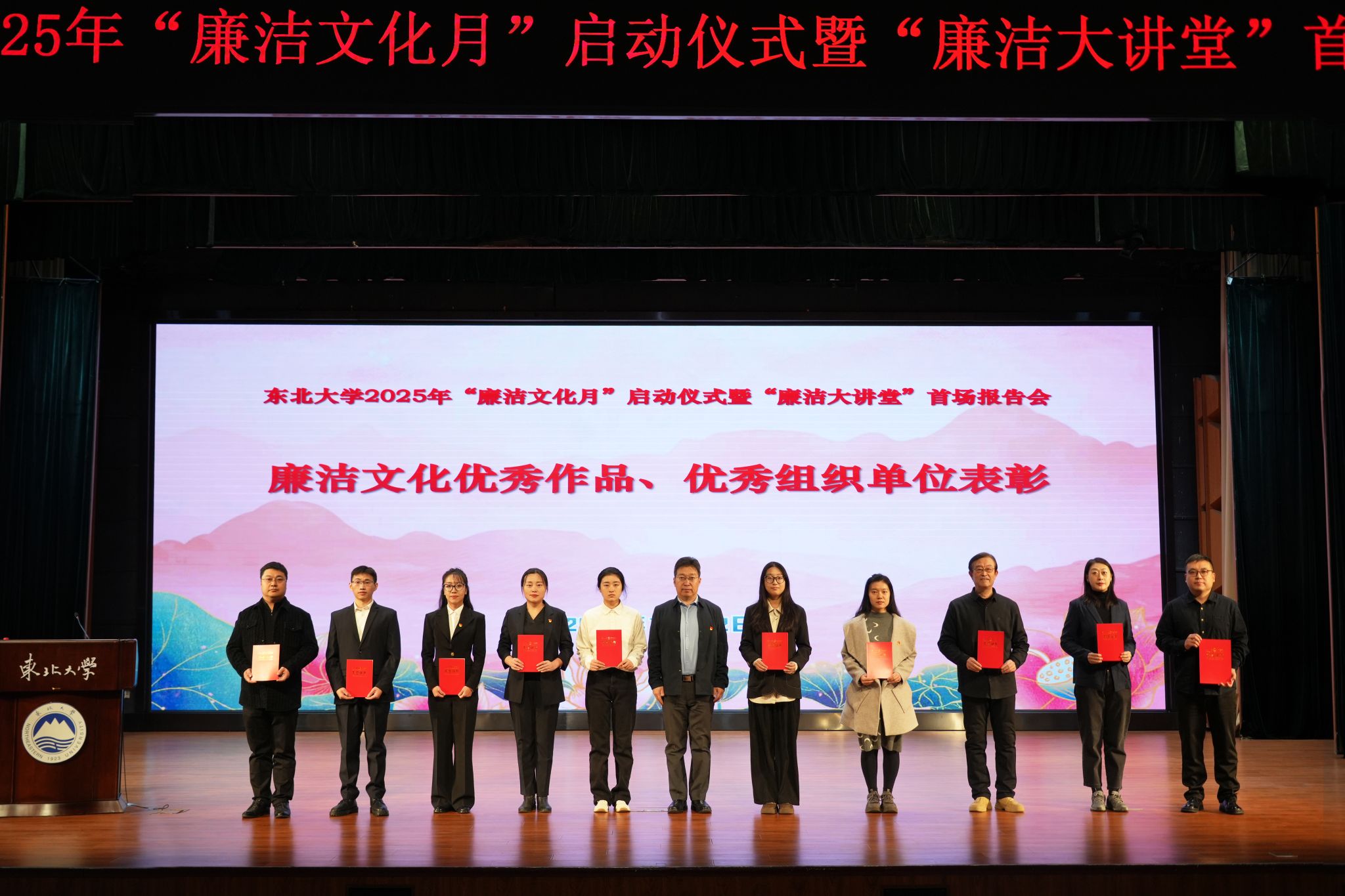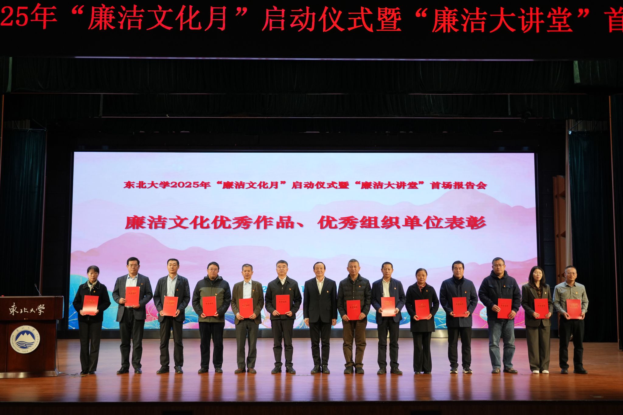 启动仪式上,相关工作负责人介绍东北大学2025年“廉洁文化月”活动方案。王兴伟宣读《近一年来省级及以上廉洁文化作品获奖情况和2025年校内廉洁教育活动评奖情况》。郭海、张皓为获校级及以上廉洁文化作品获奖代表、学校廉洁文化建设创新工程优秀成果代表、学校廉洁教育活动优秀组织单位颁奖。吴豪伟为东北大学“崇廉知行社”学生廉洁社团授旗。