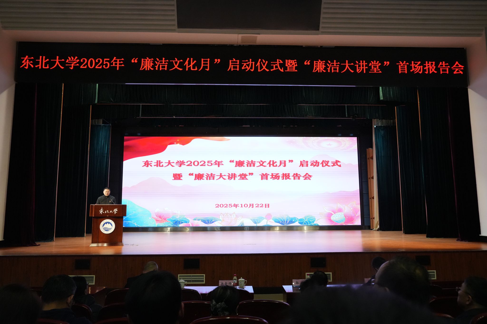 10月22日,东北大学2025年“廉洁文化月”启动仪式暨“廉洁大讲堂”首场报告会在汉卿会堂蔡冠深报告厅举行。校党委书记郭海,党委副书记、纪委书记吴豪伟,党委副书记张皓,党委常委、副校长王兴伟出席活动。校纪委委员,分党委书记、纪委书记和纪检委员,年轻干部代表、青年人才代表、校内挂职干部、获奖师生代表、“崇廉知行社”学生社团成员等参加会议。会议在秦皇岛分校设分会场。吴豪伟主持会议。