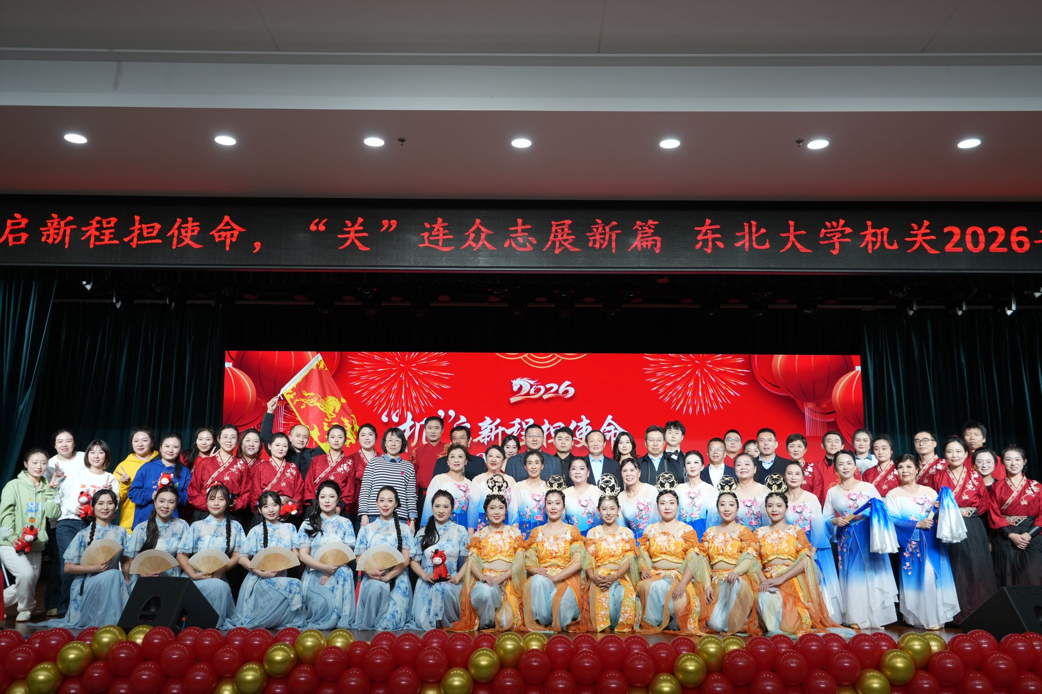 12月25日中午,由校机关党委、机关工会共同主办的“机”启新程担使命,“关”连众志展新篇校机关2026年新年联欢会在学生活动中心多功能厅举行。中国银行沈阳分行副行长刘凌冰、自贸区支行行长银炳少、自贸区支行副行长孙杨林,校党委书记郭海,校长冯夏庭,校党委副书记、纪委书记吴豪伟,校党委副书记张皓,副校长王强,党委常委、组织部部长、机关党委书记姜玉原出席活动,机关教职工近400人参加联欢会。