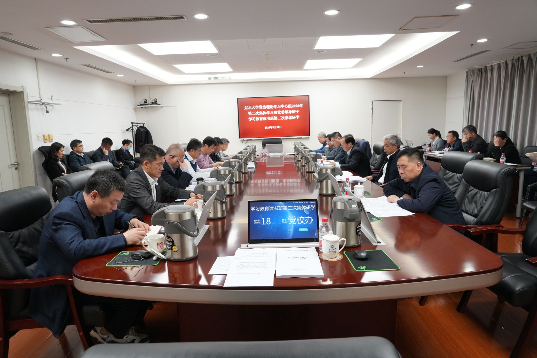 3月31日,东北大学党委理论学习中心组集体学习暨党委领导班子树立和践行正确政绩观学习教育读书班第二次集体研学在主楼1415室举行。校党委书记郭海主持学习,并领学习近平总书记在河北雄安新区考察时的重要讲话和重要指示批示精神。党委常委、党委理论学习中心组成员、学习教育工作专班成员参加学习。