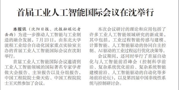 本报讯(沈阳日报、沈报融媒记者岳雨)为进一步推动人工智能与工业制造的融合发展,7月23日,由东北大学流程工业综合自动化国家重点实验室主办的首届工业人工智能国际会议在沈阳举行。