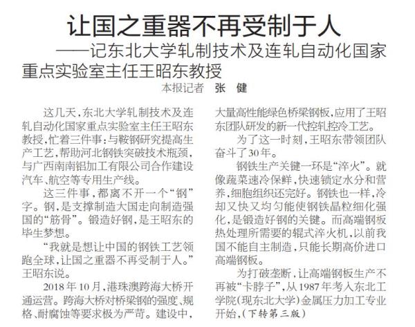 这几天,东北大学轧制技术及连轧自动化国家重点实验室主任王昭东教授,忙着三件事:与鞍钢研究提高生产工艺,帮助河北钢铁突破技术瓶颈,与广西南南铝加工有限公司合作建设汽车、航空等专用生产线。