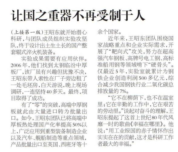 “它不在柳荫下,也不在温室里;它在辛勤的工作中,它在艰苦的劳动里。”谈起对奋斗的理解,王昭东提起了这首上世纪80年代风靡一时的歌曲《幸福在哪里》。他说:“用工业报国的赤子情怀作出实实在在的贡献,这才是科研工作者最大的幸福。”