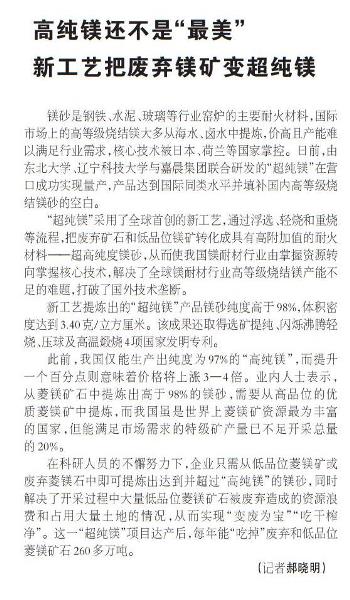 镁砂是钢铁、水泥、玻璃等行业窑炉的主要耐火材料,国际市场上的高等级烧结镁大多从海水、卤水中提炼,价高且产能难以满足行业需求,核心技术被日本、荷兰等国家掌控。日前,由东北大学、辽宁科技大学与嘉晨集团联合研发的“超纯镁”在营口成功实现量产,产品达到国际同类水平并填补国内高等级烧结镁砂的空白。