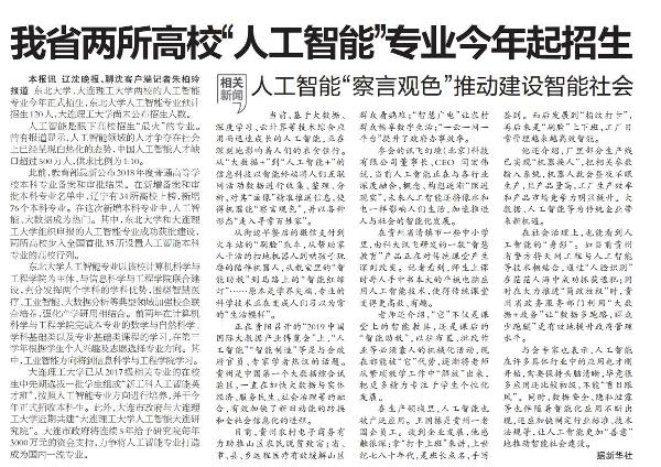 本报讯 辽沈晚报、聊沈客户端记者朱柏玲报道 东北大学、大连理工大学两校的人工智能专业今年正式招生,东北大学人工智能专业预计招生120人,大连理工大学尚未公布招生人数。