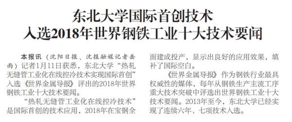 本报讯(沈阳日报、沈报融媒记者岳雨)记者1月11日获悉,东北大学“热轧无缝管工业化在线控冷技术实现国际首创”入选《世界金属导报》评出的2018年世界钢铁工业十大技术要闻。