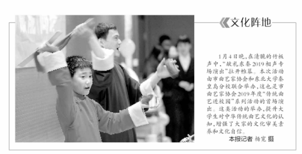 1月4日晚,在清脆的竹板声中,“献礼东秦2019相声专场演出”拉开帷幕。本次活动由市曲艺家协会和东北大学秦皇岛分校联合举办,这也是市曲艺家协会2019年度“传统曲艺进校园”系列活动的首场演出。这类活动的举办,提升大学生对中华传统曲艺文化的认知,增强了大家的文化审美素养和文化自信。 新闻来源 《秦皇岛晚报》2019年1月9日