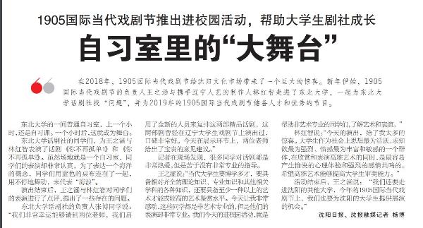在2018年,1905国际当代戏剧节给沈阳文化市场带来了一个巨大的惊喜。新年伊始,1905国际当代戏剧节的负责人王之涵与携手辽宁人艺的制作人林红智走进了东北大学,一起为东北大学话剧社找“问题”,并为2019年的1905国际当代戏剧节储备人才和优秀的节目。