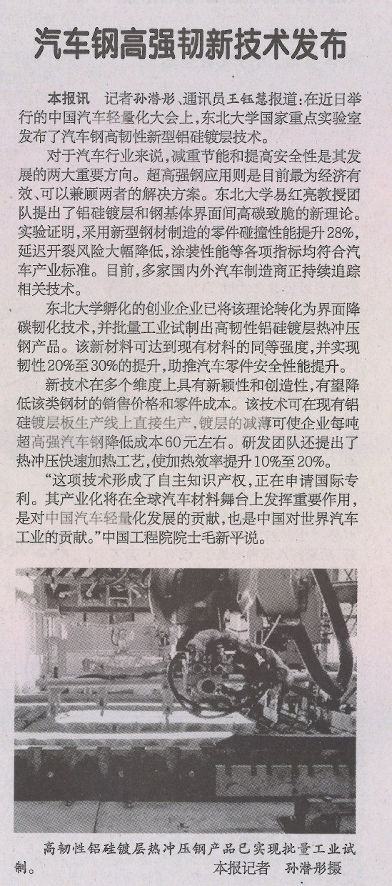本报讯 记者孙潜彤、通讯员王钰慧报道:在近日举行的中国汽车轻量化大会上,东北大学国家重点实验室发布了汽车钢高韧性新型铝硅镀层技术。