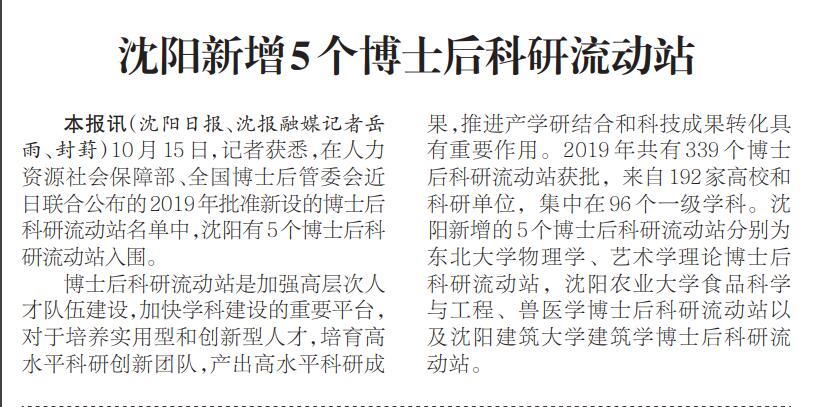 本报讯(沈阳日报、沈报融媒记者岳雨、封葑)10月15日,记者获悉,在人力资源社会保障部、全国博士后管委会近日联合公布的2019年批准新设的博士后科研流动站名单中,沈阳有5个博士后科研流动站入围。
