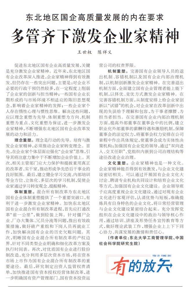 促进东北地区国有企业高质量发展,关键是充分激发企业家精神。近年来,东北地区国有企业改革深入推进,企业家精神得到有效激发,但仍存在一些突出问题,主要是:对企业不必要的行政干预仍然较多,在一定程度上削弱了企业家的创新与担当精神;一些国有企业长期形成的与市场环境不相适应的陈旧思想观念,影响着企业家精神的发挥;一些企业家个人存在惰性心理与惯性思维。解决这些问题,应以理念重塑为先导、体制重塑为方向、机制重塑为重点、文化重塑为保证,进一步激发企业家精神,不断增强东北地区国有企业改革发展的动力和活力。
