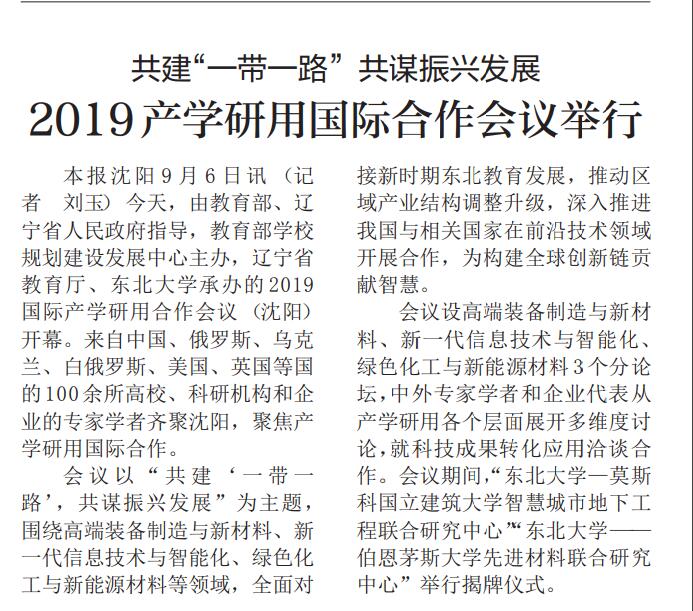 本报沈阳9月6日讯(记者 刘玉)今天,由教育部、辽宁省人民政府指导,教育部学校规划建设发展中心主办,辽宁省教育厅、东北大学承办的2019国际产学研用合作会议(沈阳)开幕。来自中国、俄罗斯、乌克兰、白俄罗斯、美国、英国等国的100余所高校、科研机构和企业的专家学者齐聚沈阳,聚焦产学研用国际合作。