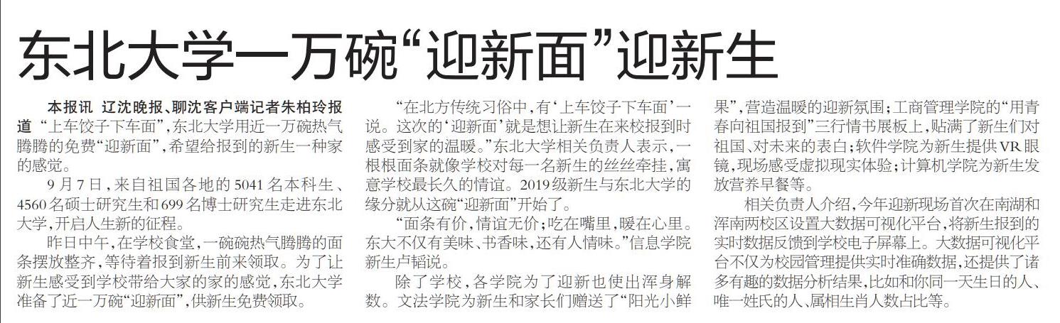 本报讯 辽沈晚报、聊沈客户端记者朱柏玲报道 “上车饺子下车面”,东北大学用近一万碗热气腾腾的免费“迎新面”,希望给报到的新生一种家的感觉。