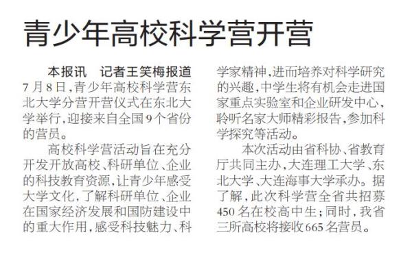 本次活动由省科协、省教育厅共同主办,大连理工大学、东北大学、大连海事大学承办。据了解,此次科学营全省共招募450名在校高中生;同时,我省三所高校将接收665名营员。