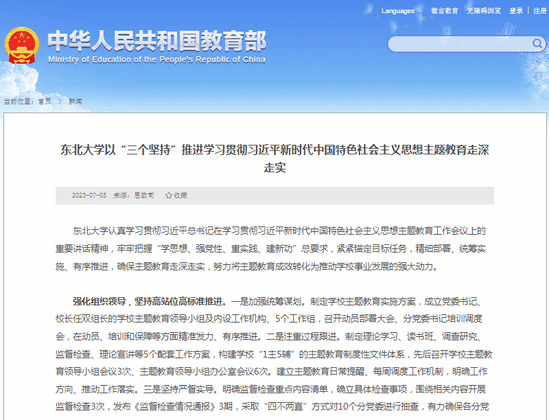 东北大学认真学习贯彻习近平总书记在学习贯彻习近平新时代中国特色社会主义思想主题教育工作会议上的重要讲话精神,牢牢把握“学思想、强党性、重实践、建新功”总要求,紧紧锚定目标任务,精细部署、统筹实施、有序推进,确保主题教育走深走实,努力将主题教育成效转化为推动学校事业发展的强大动力。