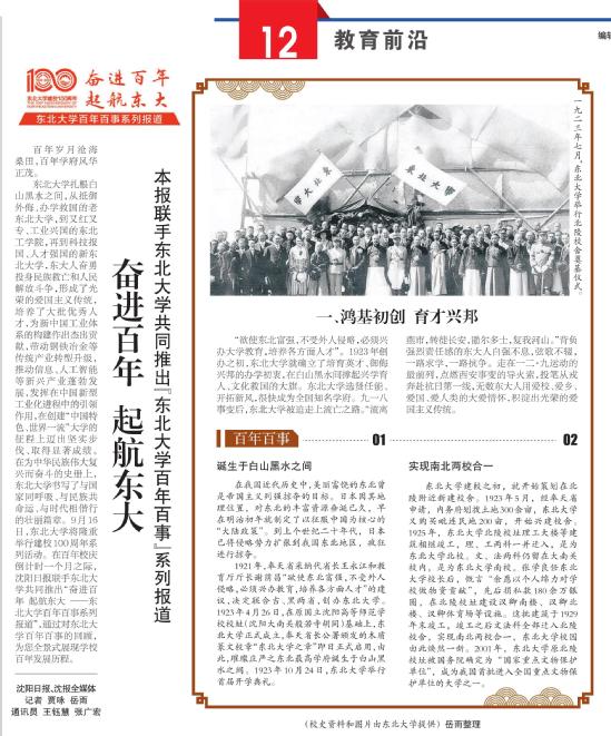 东北大学扎根白山黑水之间,从抵御外侮、办学救国的老东北大学,到又红又专、工业兴国的东北工学院,再到科技报国、人才强国的新东北大学,东大人奋勇投身民族救亡和人民解放斗争,形成了光荣的爱国主义传统,培养了大批优秀人才,为新中国工业体系的构建作出杰出贡献,带动钢铁冶金等传统产业转型升级,推动信息、人工智能等新兴产业蓬勃发展,发挥在中国新型工业化进程中的引领作用,在创建“中国特色、世界一流”大学的征程上迈出坚实步伐、取得显著成绩。在为中华民族伟大复兴而奋斗的史册上,东北大学书写了与国家同呼吸、与民族共命运、与时代相偕行的壮丽篇章。9月16日,东北大学将隆重举行建校100周年系列活动。在百年校庆倒计时一个月之际,沈阳日报联手东北大学共同推出“奋进百年起航东大——东北大学百年百事系列报道”,通过对东北大学百年百事的回顾,为您全景式展现学校百年发展历程。