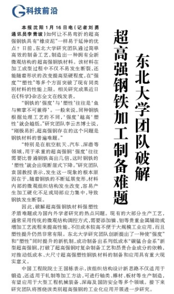 本报沈阳1月16日电(记者刘勇 通讯员李青坡)如何让不易弯折的超高强钢铁具有“橡皮泥”一样易于延伸的优点?日前,东北大学研究团队通过简单高效的制备工艺,制造出一种拥有全新微观结构的超高强钢铁材料。该材料在加工成型过程中不仅不易发生断裂,还能随着形状的改变提高坚硬程度,在“强度”“塑性”等多个方面突破了现有同类别材料的性能上限。相关研究成果近日在《科学》杂志全文在线发表。