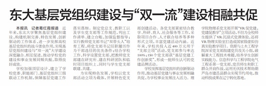 本报讯 记者葛红霞报道 近年来,东北大学聚焦基层党组织建设,构建机制完善、特色发展、创新驱动的工作体系,进一步发挥高校基层党组织的战斗堡垒作用,实现基层党组织建设与“双一流”大学建设深度融合、相互促进,推动学校党的建设和事业发展同频共振,取得良好成效。