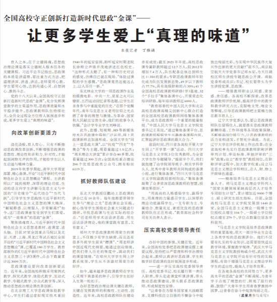 党的十八大以来,全国高校守正创新打造新时代思政“金课”,充分发挥课堂教学的主渠道作用,思政课质量和水平稳步提升,思政课教师队伍持续壮大,全员全过程全方位育人氛围逐步形成,更多学生爱上“真理的味道”。