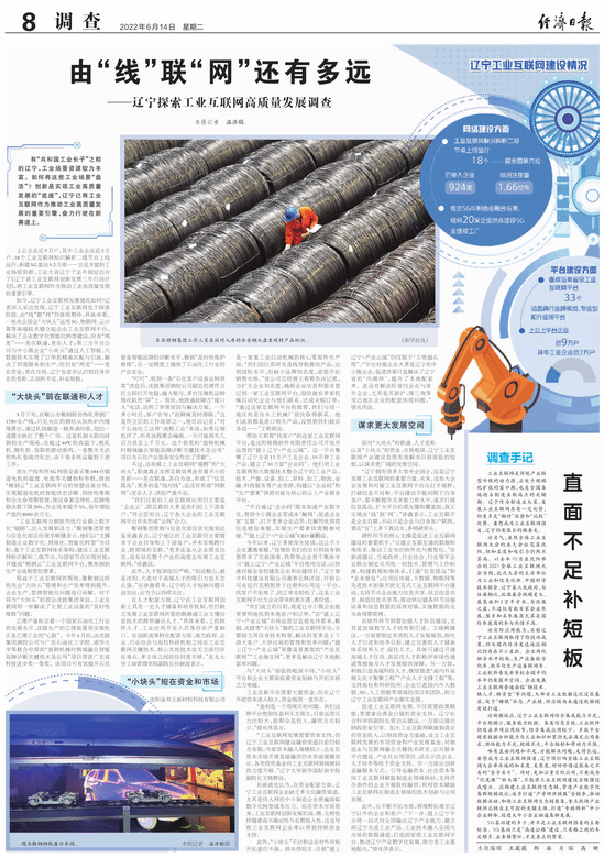 如今,辽宁工业互联网发展情况如何?记者深入采访发现,辽宁工业互联网处于探索阶段,由“线”联“网”仍值得期待。具体来看,一些央企国企“大块头”运用5G、物联网、云计算等高端技术建立起企业工业互联网平台,解决了企业数字化智能化转型建设,但有“两差”——差在联通,差在人才;第三方平台公司与中小微企业“小块头”通过人工智能、大数据技术实现了订单的精准匹配与引流,解决了供需服务和生产,但仍有“两差”——差在资金,差在市场。辽宁也逐步认识到自身存在的差距,正剖析不足,补足短板。
