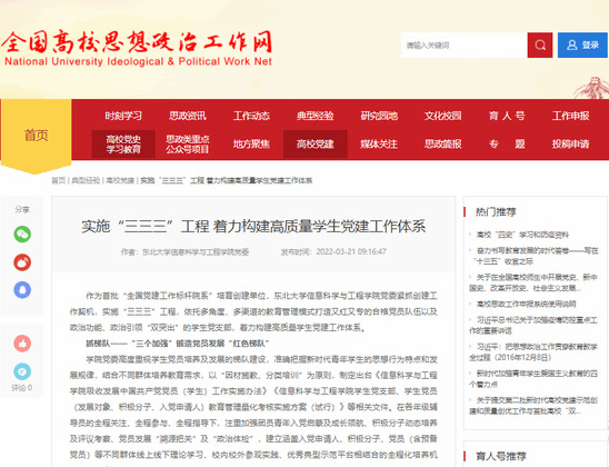作为首批“全国党建工作标杆院系”培育创建单位,东北大学信息科学与工程学院党委紧抓创建工作契机,实施“三三三”工程,依托多角度、多渠道的教育管理模式打造又红又专的合格党员队伍以及政治功能、政治引领“双突出”的学生党支部,着力构建高质量学生党建工作体系。