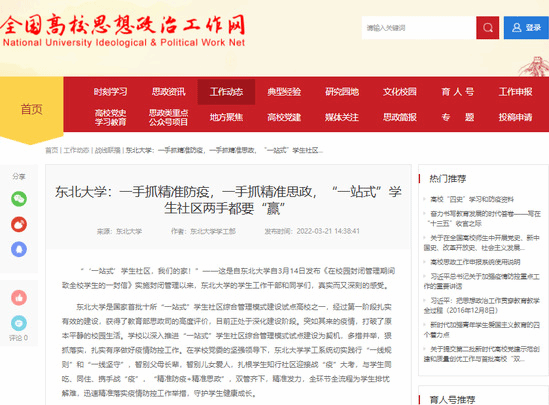 东北大学是国家首批十所“一站式”学生社区综合管理模式建设试点高校之一,经过第一阶段扎实有效的建设,获得了教育部思政司的高度评价,目前正处于深化建设阶段。突如其来的疫情,打破了原本平静的校园生活。学校以深入推进“一站式”学生社区综合管理模式试点建设为契机,多措并举,狠抓落实,扎实有序做好疫情防控工作。在学校党委的坚强领导下,东北大学学工系统切实践行“一线规则”和“一线坚守”,暂别父母长辈,暂别儿女爱人,扎根学生知行社区迎接战“疫”大考,与学生同吃、同住、携手战“疫”,“精准防疫+精准思政”,双管齐下,精准发力,全环节全流程为学生排忧解难,迅速精准落实疫情防控工作举措,守护学生健康成长。